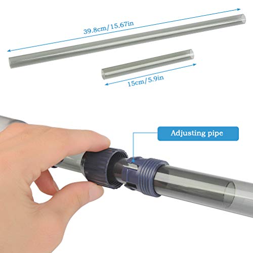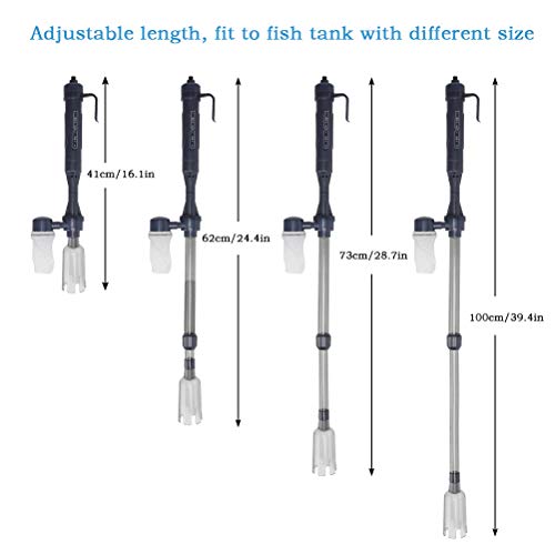 4 soorten maten om vrij te vervangen: Aquariumreiniger pomp wordt geleverd met 3 buizen met 2 maten, zodat je 4 soorten lengte hebt om te kiezen voor het reinigen van vistank met verschillende grootte, waaronder 41 cm/16,1 inch, 62 cm/24,4 inch, 73 cm/28,7 inch, 100 cm/39,4 inch.