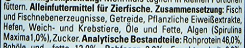 Premium voer voor alle tropische siervissen, complete voeding voor siervissen. Samenstelling: vis en visbijproducten, granen, plantaardige eiwitextracten, gist, zachte en kreefdieren, oliën en vetten, algen (Spirulina Maxima1,0%), suiker. Analytische bestanddelen: ruwe eiwitten 46,0%, ruwe oliën en vetten 12,0%, ruwe vezels 3,0%, vochtgehalte 9,0%. Additiestoffen: Vitaminen, provitamine en chemisch gedefinieerde stoffen met een vergelijkbaar effect: Vitamine A 29810 IE/kg, vitamine D3 1860 IE/kg, L-carnitine 123 mg/kg. Verbindingen van sporenelementen: E5 mangaan 67 mg/kg, E6 zink 40 mg/kg, E1 ijzer 26 mg/kg, E3 kobalt 0,5 mg/kg. Kleurstoffen, conserveringsmiddelen, antioxidanten.Voedingsadvies: meerdere keren per dag in kleine porties voeden.